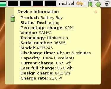 Zdravím , připravuju si přechod na linux na svém notebooku HP probook 4515s a všechno mám v podstatě vyřešené až na jedno . Na windows 7 jsem používal program pro zobrazení stavu baterie Battery Bar. Ten zobrazoval krom času do vybití a procent také kapacitu baterie (celkovou a aktuální), opotřebení baterie a hlavně odběr notebooku (ve watech) což je hlavní věc která mi chybí a podle které jsem si ve win 7 nastavoval komponenty tak abych doáshnul co nejnižší spotřeby. Existuje nějaká slušná náhrada na ubuntu (gnome) ? ideálně jako prográmek na lištu. Díky za pomoc